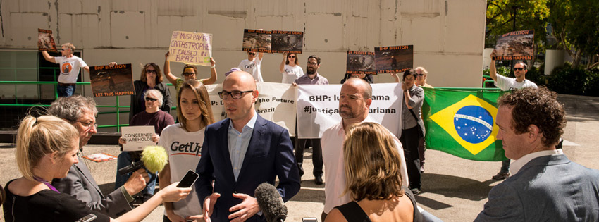 desastre em Mariana (MG) e no Vale do Rio Doce, receberam o recado na Austrália. Na última quinta-feira, levamos as vozes dos brasileiros que pedem por justiça em Mariana até a sede da empresa em Perth, na Austrália. A BHP, em conjunto com a brasileira Vale, controla a Samarco, mineradora responsável pelo deslizamento de lama composto por rejeitos minerais que destruiu o Mariana e mais 500km ao longo do Rio Doce, deixando 19 vítimas e mais de 600 pessoas desalojadas. Cerca de 20 ativistas levaram cartazes e banners pedindo por justiça para Mariana na reunião anual da BHP Billiton, questionando a segurança das barragens construídas no Brasil. Os acionistas da empresa sentiram o drama - e a lama - que está por trás de seu lucro! Não vamos parar por aqui! Seguiremos expondo os impactos do desastre e pressionando as mineradoras e o governo a tomar providências. Isso inclui a promoção de uma investigação independente sobre as causas do desastre, o pagamento de valores condizentes com a proporção desta gigantesca tragédia e a garantia de que as demais barragens não ofereçam nenhum risco às comunidades e ao meio ambiente. |